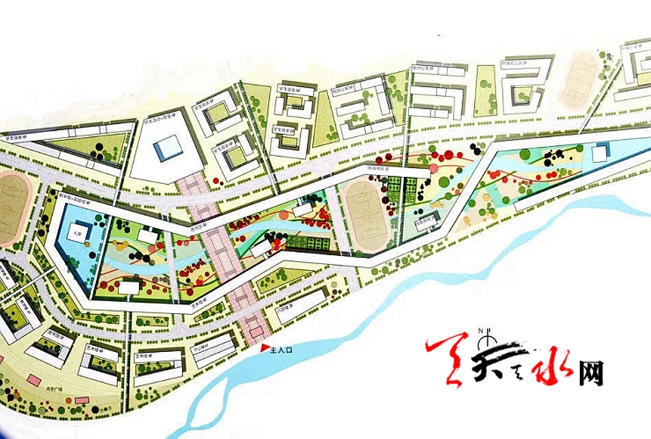 天水市职教园区选址位于秦州区藉口镇白草滩村,总占地1100多亩,初步规划为“一院、两校、一区”结构。“一院”即一所高职标准的职业学校,建成后规划在校学生12000人,实行中高职一体化办学;“两校”即两所基础教育学校,附设九年一贯制学校和幼儿园各一所,以解决教职工和周边群众子女就学问题;“一区”即一个教职工生活住宅区,规划占地60亩。