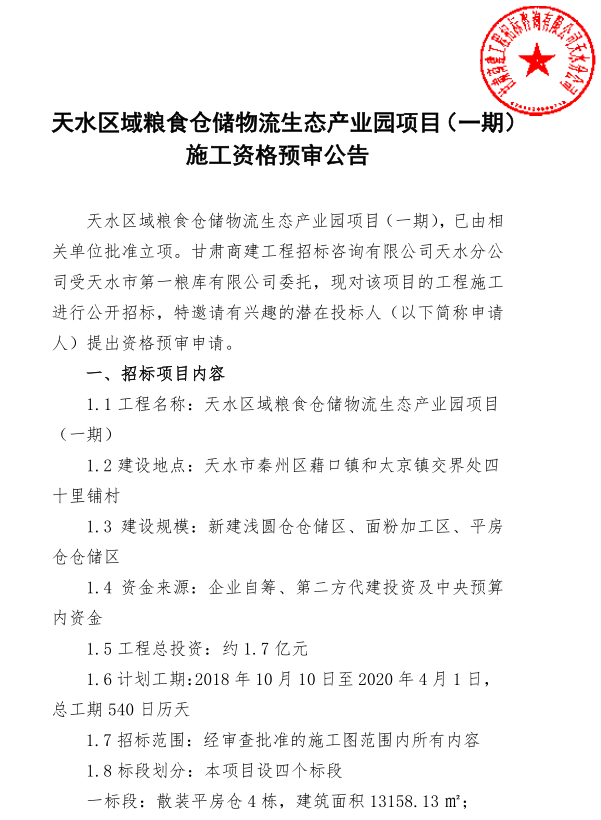 天水区域粮食仓储物流生态园区位于天水市秦州区藉口镇和太京镇交界处四十里铺村;建设规模为新建浅圆仓仓储区、面粉加工区、平房仓仓储区;工程总投资约1.7亿元;计划工期为2018年10月10日至2020年4月1日,总工期 540 日历天。