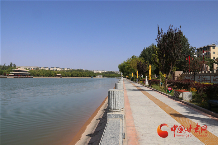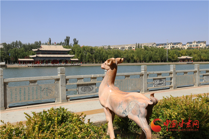 敦煌市党河风情线水天一色。九色鹿传奇的故乡,一尊九色鹿雕塑守望者党河,勾勒出一幅宁静画面。