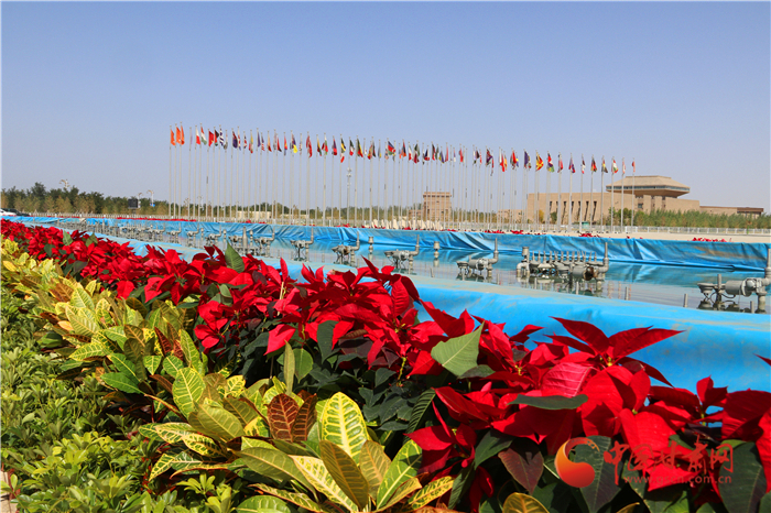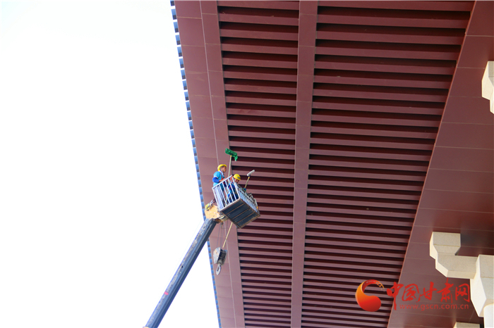 敦煌国际会展中心,随着文博会临近节日的气氛也越来越浓,准备就绪的场馆将迎来四海宾朋。工作人员也抓紧为场馆“洗脸”,以最好的状态迎盛会。
