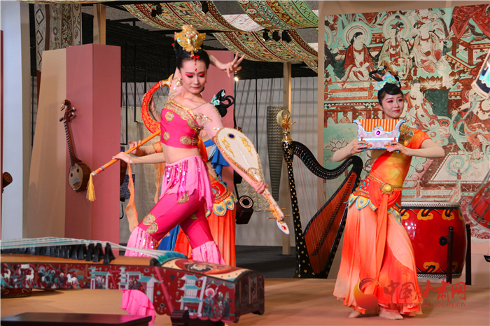 敦煌国际会展中心展区,敦煌乐舞舞蹈演员正在场馆抓紧排练,准备迎接第三届敦煌文博会文化展览开展仪式。而在敦煌,敦煌乐舞早已成为一张城市名片,和乐舞演员合影也成为嘉宾们美好的回忆。
