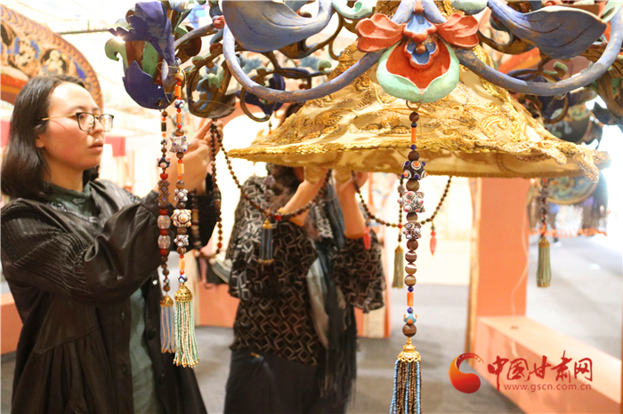 敦煌国际会展中心展区,布展人员正在抓紧对华盖灯饰品进行最后的装饰。华盖寓意吉祥,在敦煌莫高窟壁画中有描绘。艺术家通过3D效果设计,让壁画中平面华盖走进生活,成为寓意吉祥的装饰品。