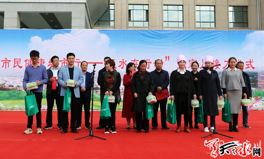 接力活动启动仪式上,宣读了《健康与您同行》倡议书,现场交接了“新市民健康城市行—天水在行动”旗帜,向流动人口代表发放了健康工具包,免费为群众体检,发放健康工具包、资料袋等,为群众送知识、送信息、送服务、送健康。