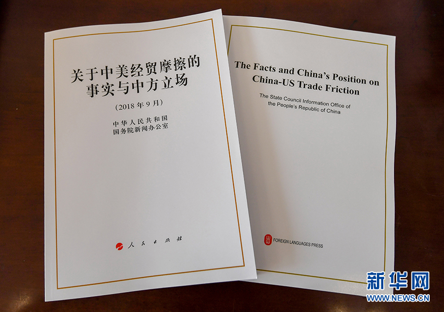 这是9月25日拍摄的《关于中美经贸摩擦的事实与中方立场》白皮书中文版和英文版。新华社记者陈晔华摄