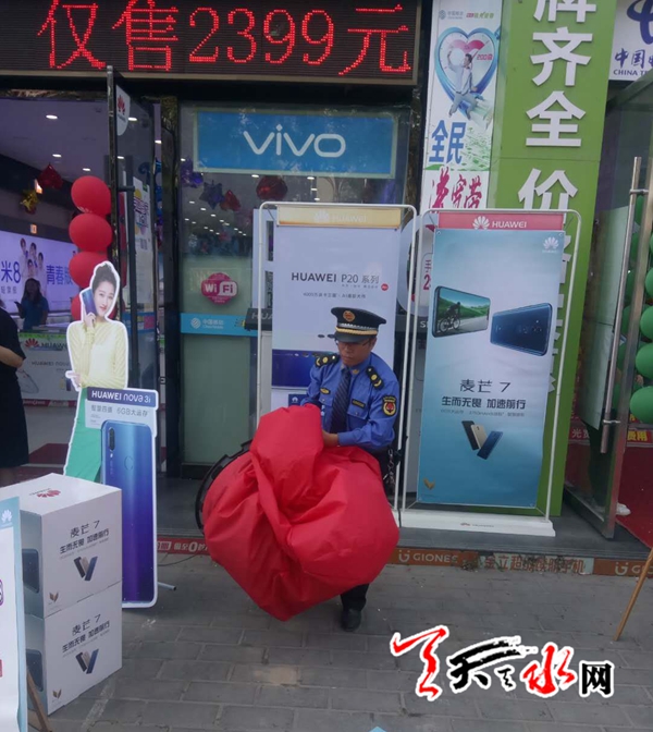 天天天水网讯 随着国庆节的来临,为招揽顾客,商家的宣传活动逐渐增多,秦州区执法局大城中队为规范充气拱门设置,保障整洁、有序、安全的市容环境,在辖区内开展拆除未审批充气拱门专项行动。
