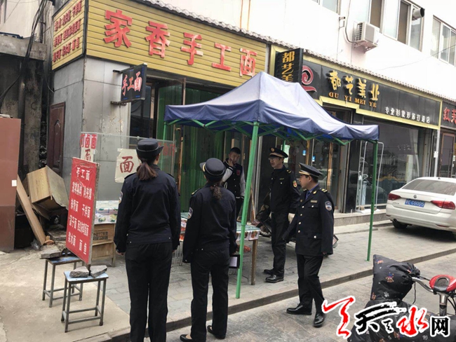 在这次集中整治行动中,重点对辖区内主干道流动摊点、沿街商铺倚门经营进行集中整治外,还主要对背街小巷店外经营、占道堆放物料,乱搭乱建等行为进行了全面整治。整治期间,秦州区执法局大城中队执法人员采取宣传教育先行,向商户告知不得倚门经营,责令商铺负责人将超出门店外的经营物品搬入店内经营,并禁止乱堆乱放,乱搭乱建。本次行动纠正店外经营45家,规范占道经营20处,清理流动摊点50处,处罚占道堆放物料1处。