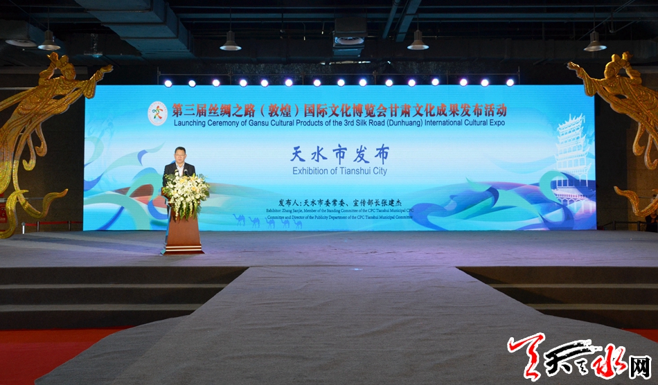 天天天水网敦煌电【记者马凯】9月28日,第三届丝绸之路(敦煌)国际文化博览会甘肃文化成果发布活动在敦煌会展中心举行,天水市委常委、宣传部长张建杰向与会嘉宾介绍天水文化旅游成果。