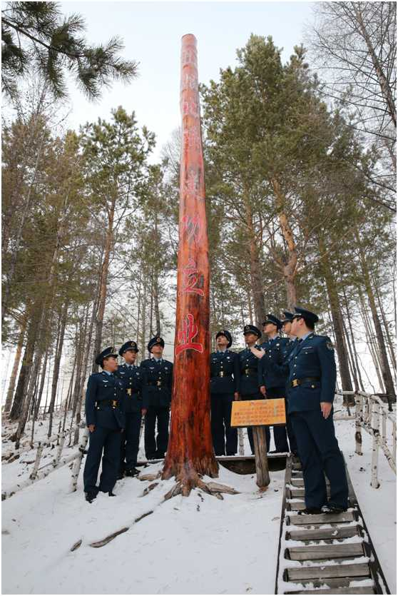 “扎根北陲,建功立业”。2013年,七棵松中的奉献松因当年过火严重已经干枯,为了让后人铭记这个“老战友”烈火摧不垮,风雪折不断的精神,5名将要退役的老兵冒着刺骨的寒风,在20多米高的脚手架上每天都忙个不停,雕刻、剖光、刷油,终于在退伍前让古松化身成激励官兵们奋力前行的精神丰碑。(赵磊)