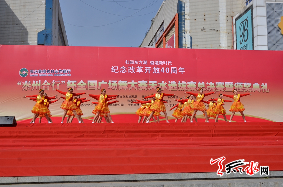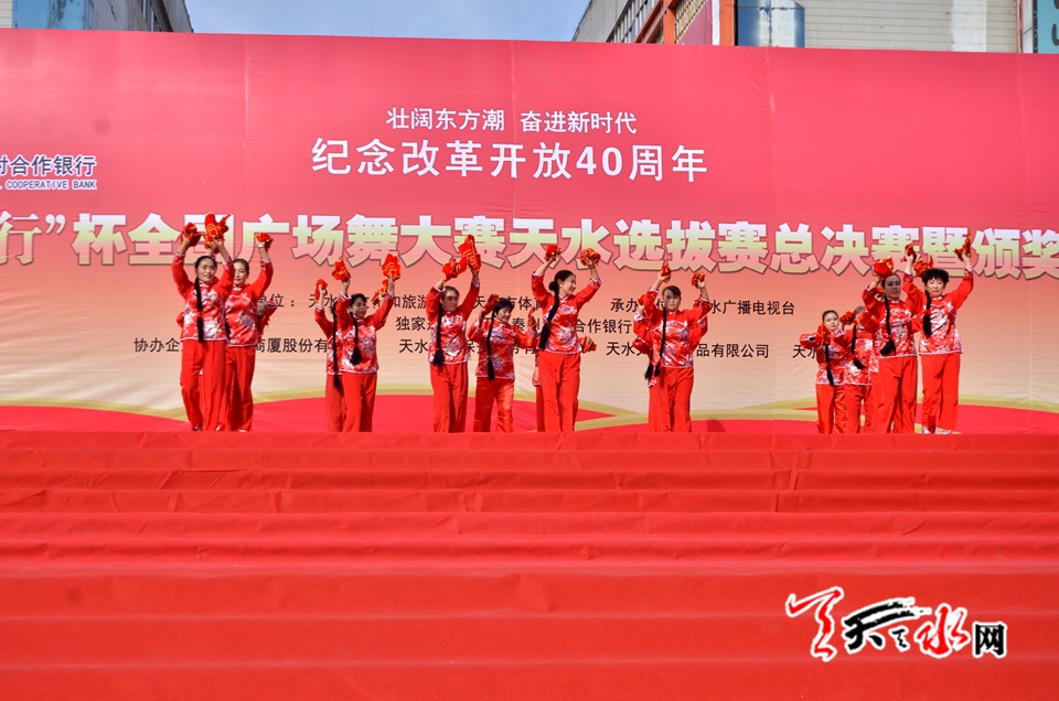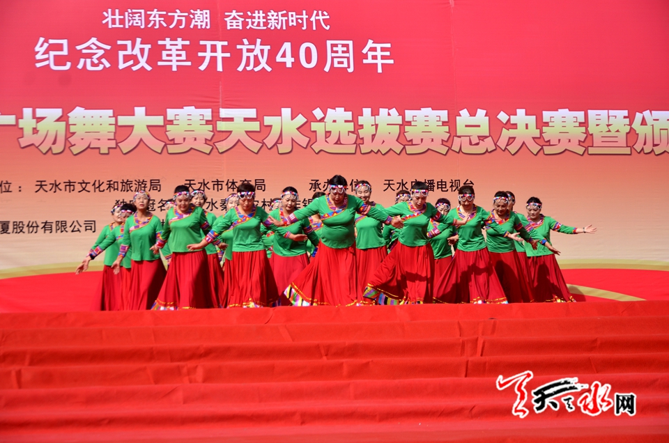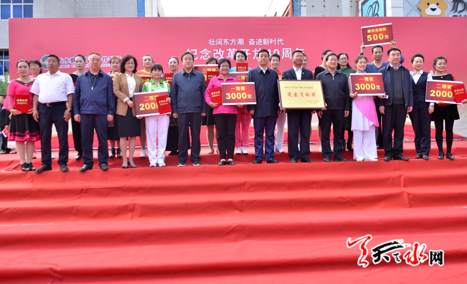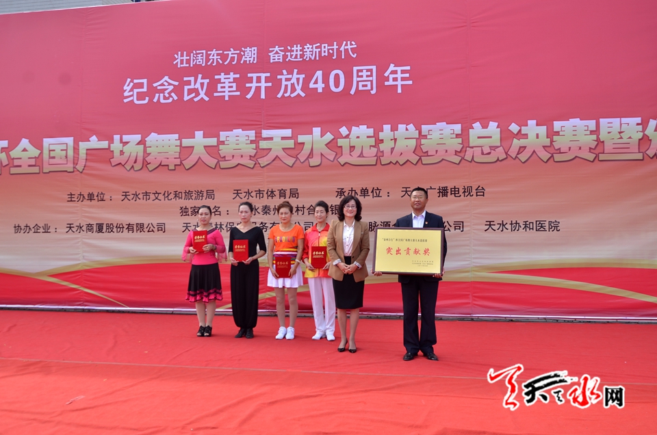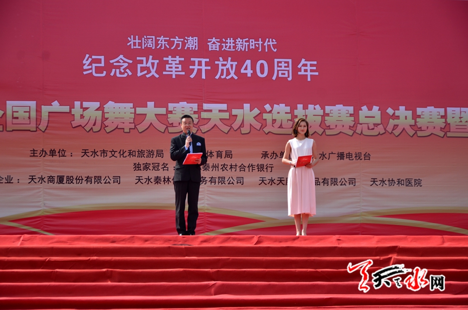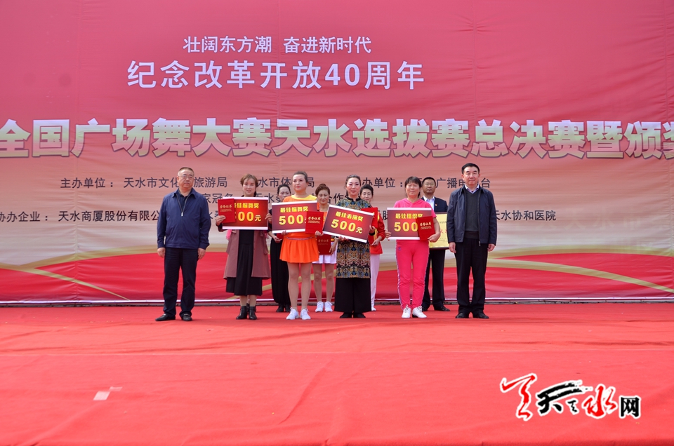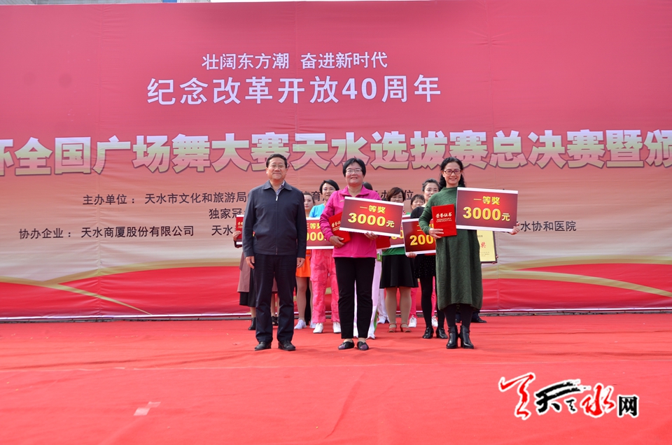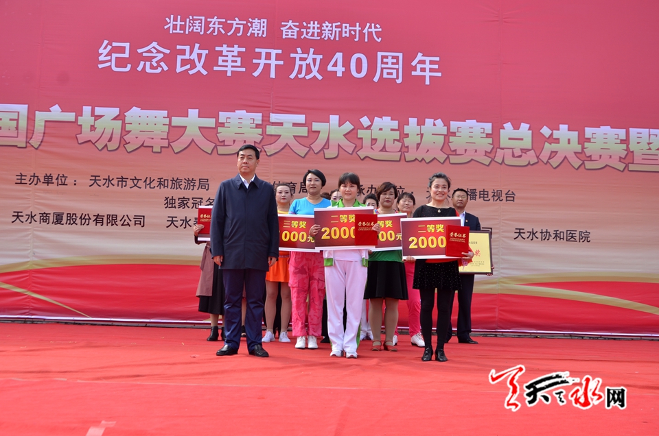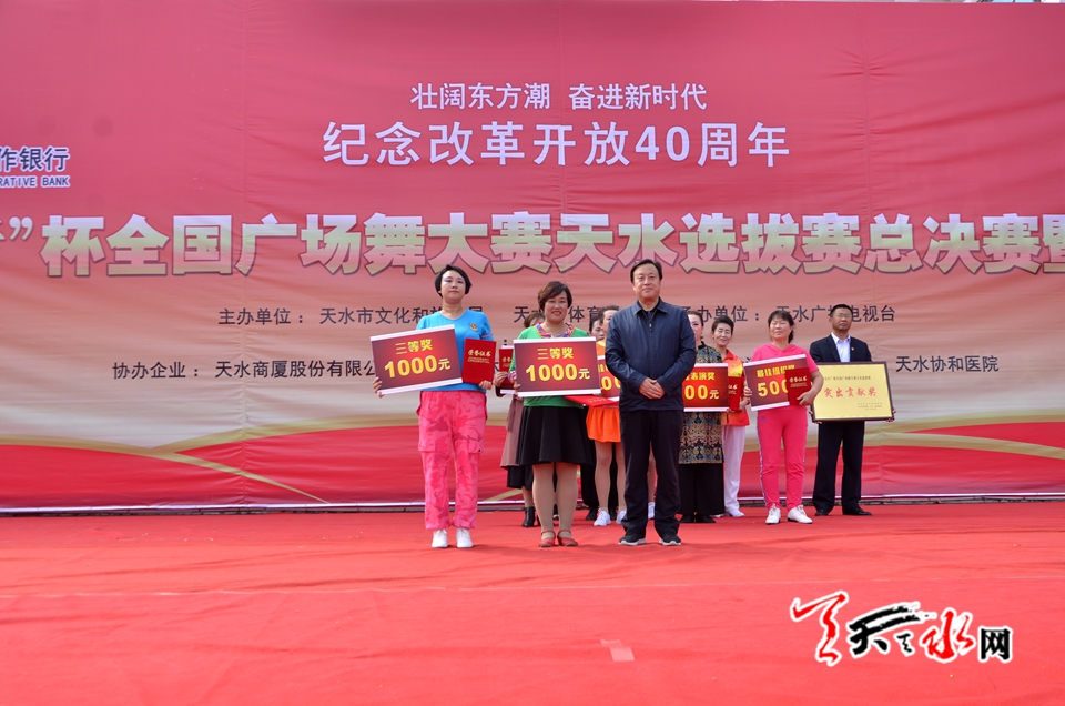 天天天水网讯(记者罗馨)壮阔东方潮,奋进新时代。为庆祝改革开放40周年营造积极的社会氛围,带动群众性文化活动蓬勃开展,由天水市文化和旅游局、天水市体育局联合主办,天水广播电视台承办,天水秦州农村合作银行独家冠名的全国广场舞大赛天水选拔赛总决赛暨颁奖盛典于9月29日在天水市龙城广场隆重举行。天水市人大常委会副主任蒲朝晖,天水市政府副市长逯克宗等领导及嘉宾出席本次活动并为获奖代表队颁奖。