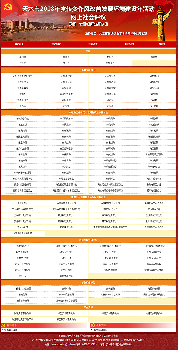 天天天水网讯 为进一步推动作风建设年活动深入开展,近期,市作风建设年活动领导小组办公室将对7个县区、市直党群部门、市政府工作部门及直属机构、公共服务行业单位等135个部门、单位,开展转变作风改善发展环境建设年活动满意度情况,组织开展网上社会评议。