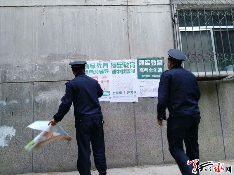 二、疏堵结合治理“乱张贴”现象。随着国庆长假的来临,各类广告横幅“乱张贴”增多,针对此问题,玉泉中队对乱张贴现象较为严重的师院路、合作南路等路段加大了巡查力度。通过抓重点路段和无间断巡查的方式,有效遏制了乱张贴行为。确保了辖区市容环境的亮丽整洁。