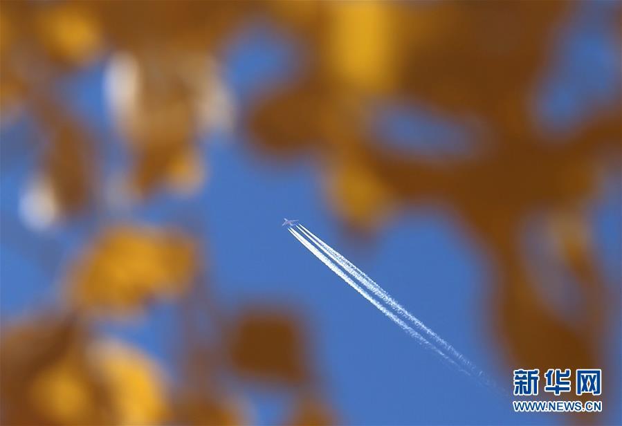 10月6日,一架飞机从甘肃省敦煌市莫高镇的胡杨林上空飞过。