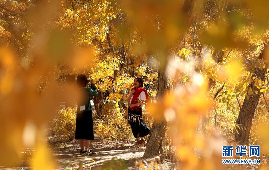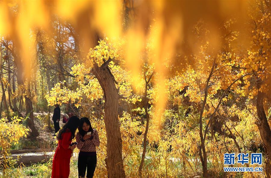 10月6日,游客在甘肃省敦煌市莫高镇的胡杨林中游玩。新华社发(张晓亮 摄)