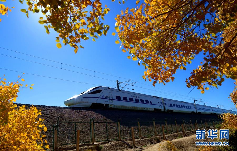 10月6日,一列动车从甘肃省敦煌市莫高镇的胡杨林旁驶过。新华社发(张晓亮 摄)