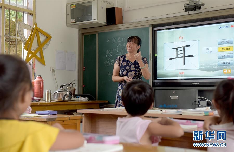 在安徽省黄山市黄山区乌石镇清溪中心小学茶儿垅村教学点内,蒋秀兰老师在给孩子们上语文课(9月7日摄)。今年53岁蒋秀兰老师从1983年参加工作开始,一直独自坚守在“一人一校”的单班教学点,最多的时候独自一人带过26名学生,目前她负责两个年级5个孩子7门课的教学。 新华社记者 王正忠 摄