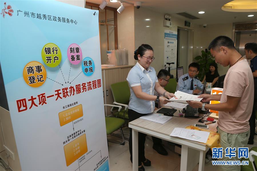 7月19日,“四大项一天联办服务专窗”在广州市越秀区政务服务中心亮相,工作人员将营业执照递交给申请者。 新华社记者 张加扬 摄