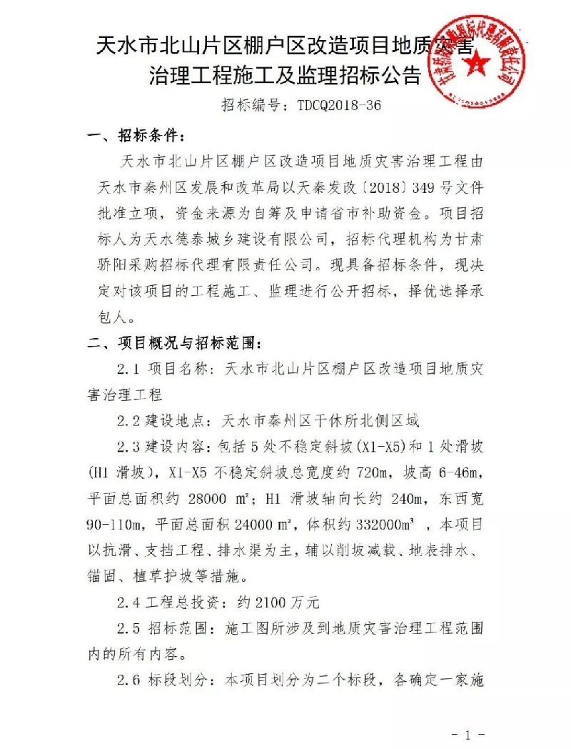 据了解,天水市北山片区棚户区改造项目地址灾害治理工程,建设地点位于秦州区干休所北侧区域,总投资约2100万元。工程建设包括:5处不稳定斜坡和1处滑坡,其中不稳定斜坡总宽度约720m,坡高6—46m,平面总面积为28000㎡;斜坡轴向长约240m,东西宽90—110m,平面总面积24000㎡,体积约332000m3。该项目以抗滑、支挡工程、排水渠为主,辅为削坡减载、地表排水、锚固、植草护坡等措施。