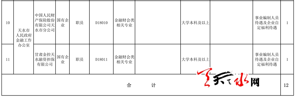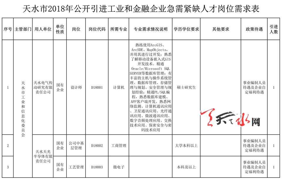 天水市2018年面向社会公开引进工业和金融企业急需紧缺人才12名。