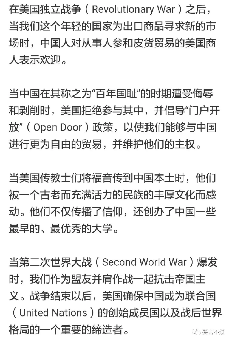 相信彭斯是可以很容易地调阅这些档案的,用来支撑他所谓“当中国在其称之为‘百年国耻’的时期遭受侮辱和剥削时,美国拒绝参与其中,并倡导门户开放政策,以使我们能够与中国进行更为自由的贸易,并维护他们的主权。”