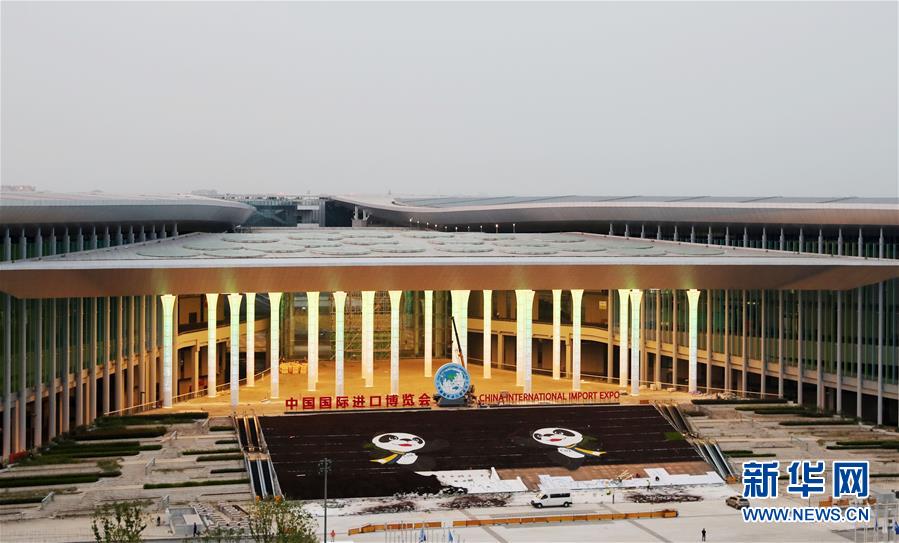 2018年9月30日,中国国际进口博览会举办地国家会展中心(上海)南广场灯光柱亮起,吉祥物“进宝”的图案也装饰到位。新华社记者 方喆 摄