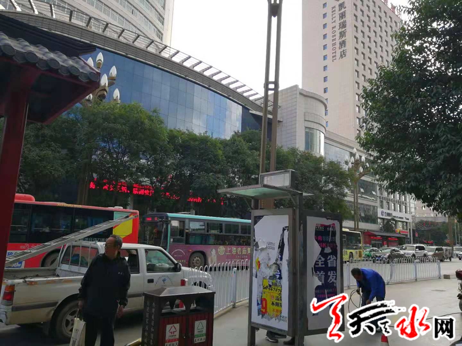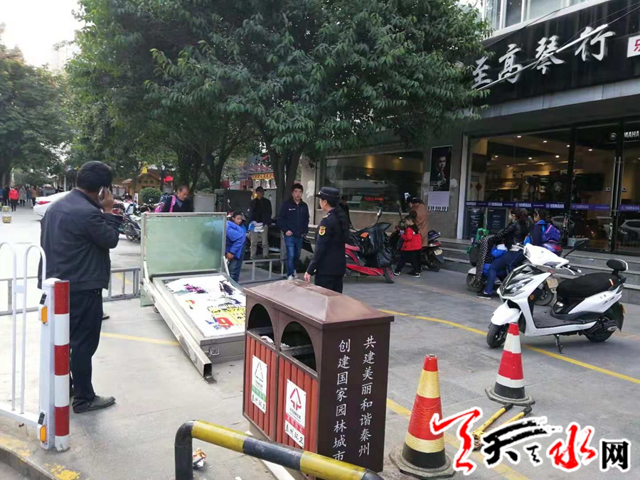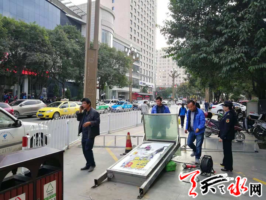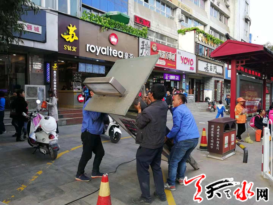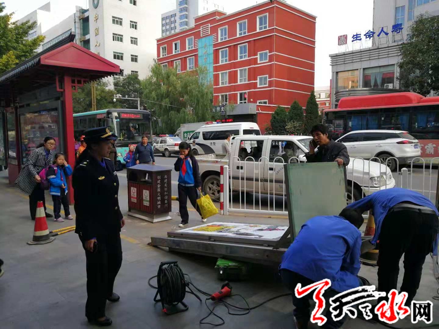 天天天水网讯(通讯员 孟剑锋) 秦州区执法局东关中队在“转变工作作风严明工作纪律 改善发展环境建设年活动”以来,始终把人民群众的利益放在首位,解群众之忧,急群众所急。为改善城市市容市貌,优化城市环境,2018年10月11日下午,秦州区执法局东关中队对位于迎宾馆公交站牌西侧及天水市政务大厅公交站牌东侧2块违规设立的广告牌予以拆除。