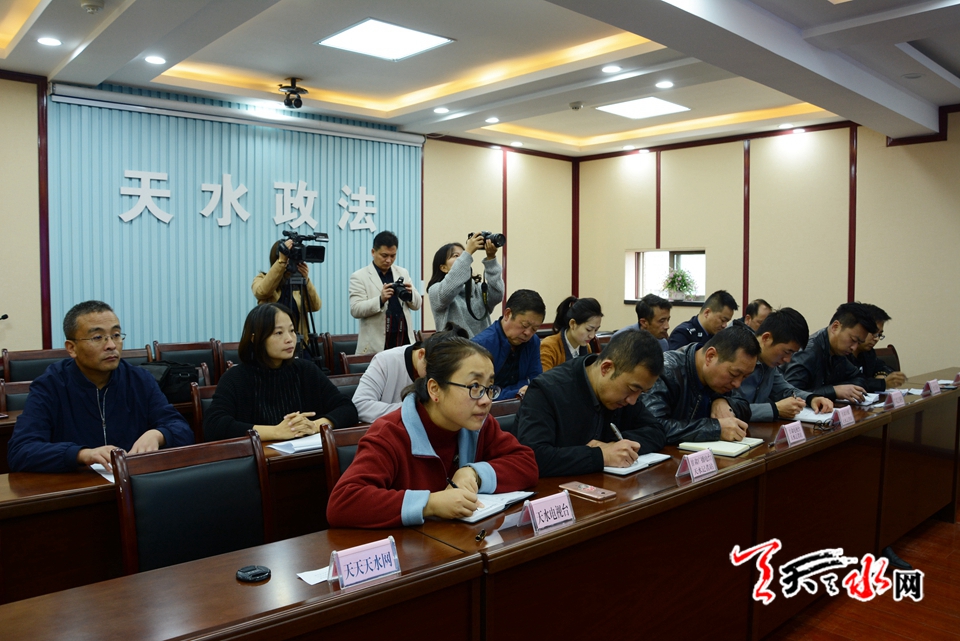 发布会由天水市委政法委副书记、市扫黑除恶专项斗争领导小组办公室主任陈璧田主持,市纪委副书记、监委副主任、市扫黑办副主任曹明忠,市委组织部副部长、市非公经济和社会组织工委书记丁晓来,市中级法院副院长、市扫黑办副主任刘新平,市检察院副检察长、市扫黑办副主任高学斌,市公安局副局长、市扫黑办副主任杨金生出席本次新闻发布会,《甘肃日报》、甘肃电视台、《甘肃法制报》、《天水日报》、天水电视台、天天天水网等媒体参加发布会。