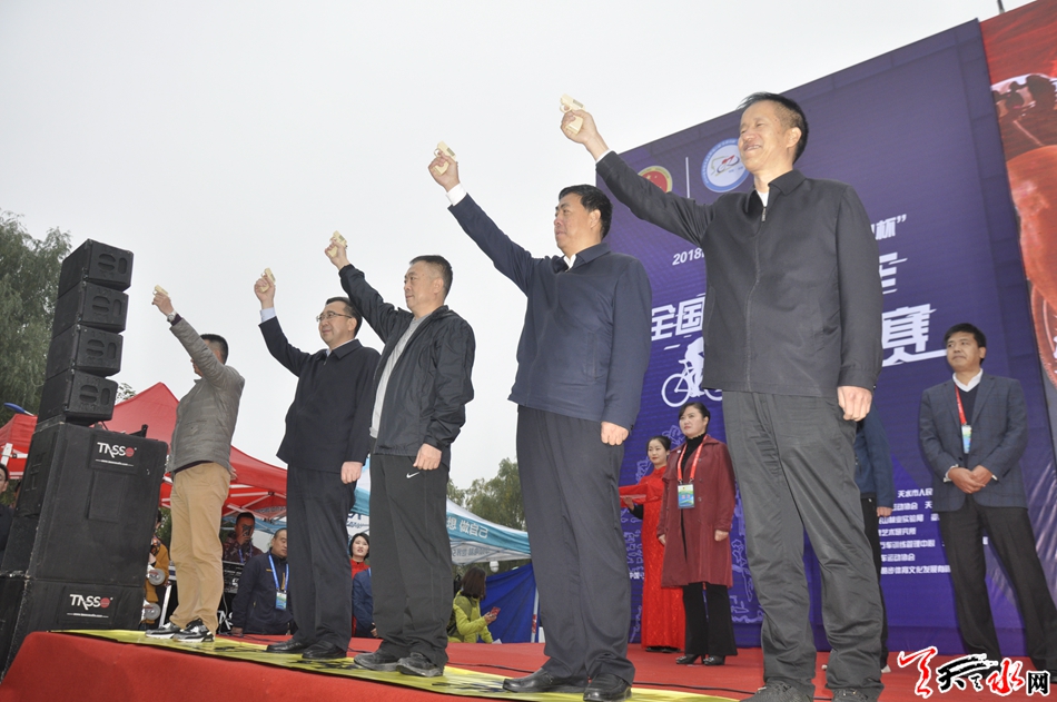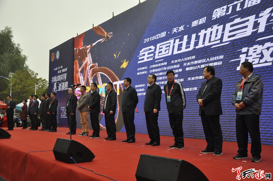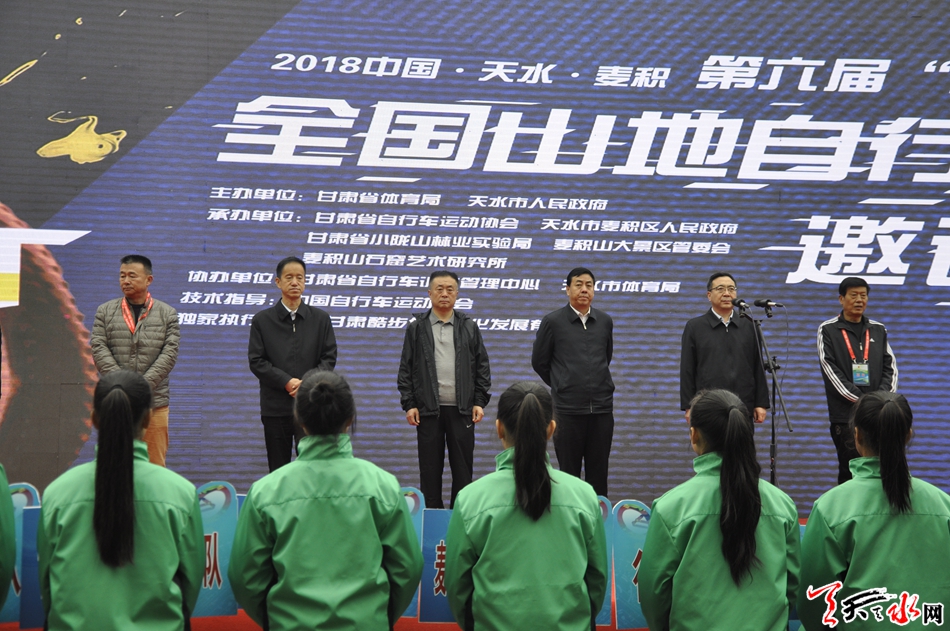 当天上午九点整,开幕式正式举行。市人大常委会主任、市委秘书长蒋晓强,副市长逯克宗,市政协副主席苏定武,市政协副主席、麦积区委书记张智明,甘肃省自行车训练管理中心党委书记何立华为2018年中国·天水·麦积第六届“麦积山杯”全国山地自行车邀请赛鸣枪开赛。