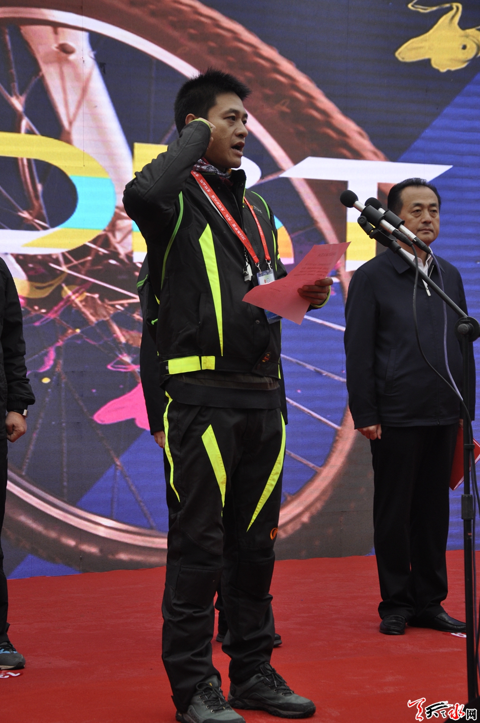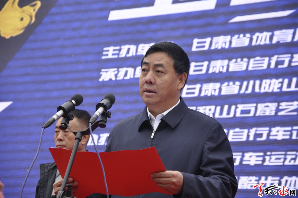 在发车仪式上,市政协副主席、麦积区委书记张智明致辞, 他表示,近年来,天水市麦积区充分发挥文化旅游资源优势,积极探索体育与文化、旅游等方面融合发展新机制,重点开发建设寻根祭祖、生态休闲、石窟文化艺术、养生保健、现代农业观光、山地自行车和龙舟赛事游等精品旅游品牌和旅游线路,实施了一大批文化旅游项目,着力搭建大型赛事等宣传平台,全方位宣传推介麦积的旅游特色和历史文化,形成了以各类特色体育赛事为载体、以基层群众体育健身活动为依托的体育发展新模式,为打造宜居、宜业、宜游美丽新麦积奠定了坚实基础。