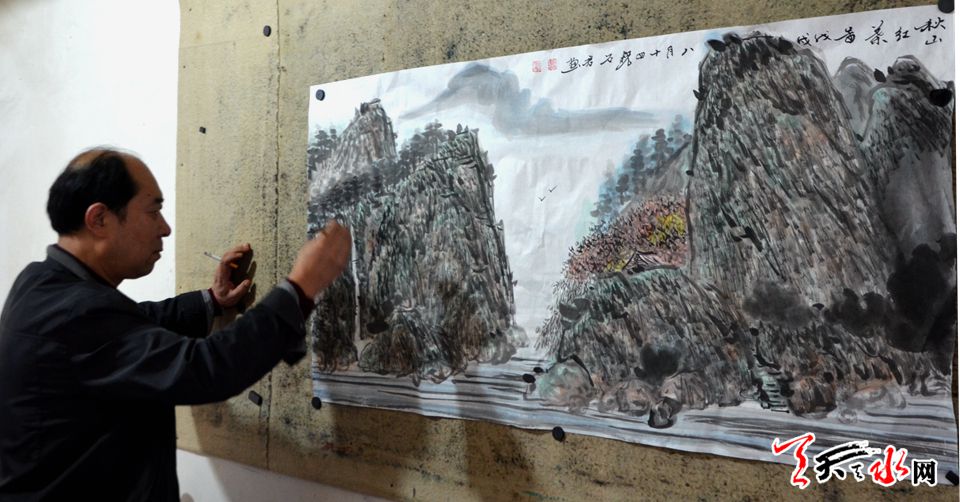 人们常说,画如其人。10月12日,在麦积区马跑泉镇什字坪的宁五平家里,前来切磋交流书画的人络绎不绝。热情好客的宁五平脸上洋溢憨厚的笑,他一边招呼大家一边即兴铺展开宣纸,廖廖几笔,便勾勒出了一幅写意山水画。这种得大自然之灵性,得山川草木之真趣,其画点线面俱全,满而不实,实中有虚,其平谈天真,朴素自然之气,流露笔端,跃然纸上,令观者心旷神怡,如沐春风。