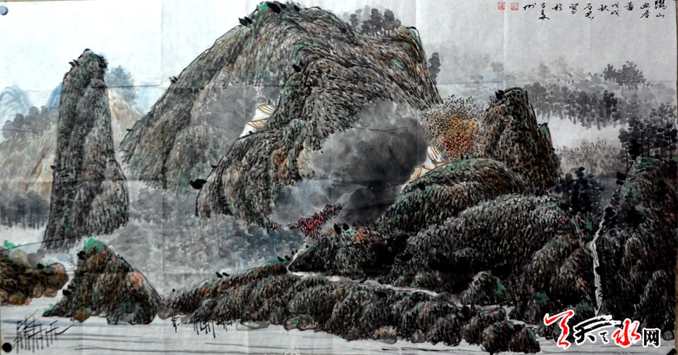 宁五平的画,他把传统与创新迥然不同之处揉和在一起,他的画讲究的是力量,是色彩的魅力,不像一些画家那样一味追求虚幻飘逸、笔墨快意消极的没有生活的画风,在他众多的作品中,有意大胆地削弱了水墨在宣纸上的表现功能,强调画面干裂拙朴、点彩的活力以及有节奏的物象轮廓线营造的运动感,一改绘画千人一面的尴尬局面,创造了一套属于自己的书画创作表现方式。