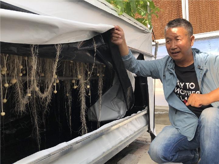 李进福打开卷帘展示微型种薯。新华社记者张文静摄