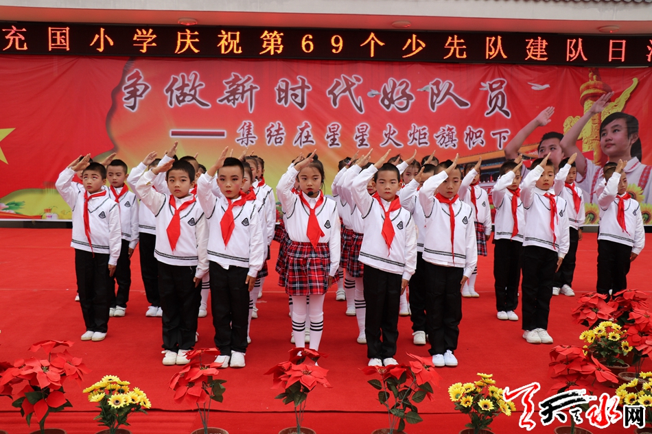 天天天水网讯(记者 刘晓亚)2018年10月13日,与祖国共同成长的中国少年先锋队迎来了她69周岁的生日。清水县充国小学于10月12日举行了“星星火炬下,我做好队员”纪念第69个建队日主题活动。本次建队日主题纪念活动共由“少先队队活动展演”和“少先队歌曲大家唱”两部分组成。