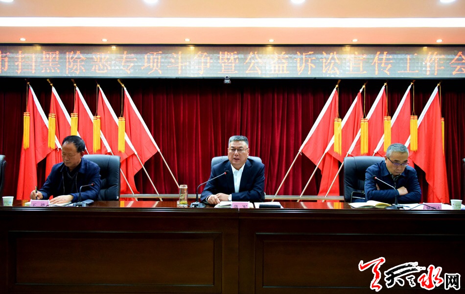 天天天水网讯【记者 童强】10月16日,全市扫黑除恶专项斗争暨公益诉讼宣传工作会议召开。市委常委、政法委书记蒲军出席会议并讲话。他强调,要把宣传发动工作贯穿扫黑除恶专项斗争和公益诉讼工作全过程和各阶段,认真谋划,强力实施,着力营造浓厚舆论氛围。