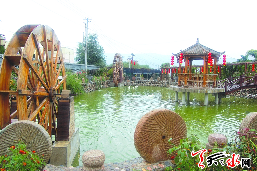 胡大村景色宜人的文化公园内,水车、磨盘与花草相映成趣。