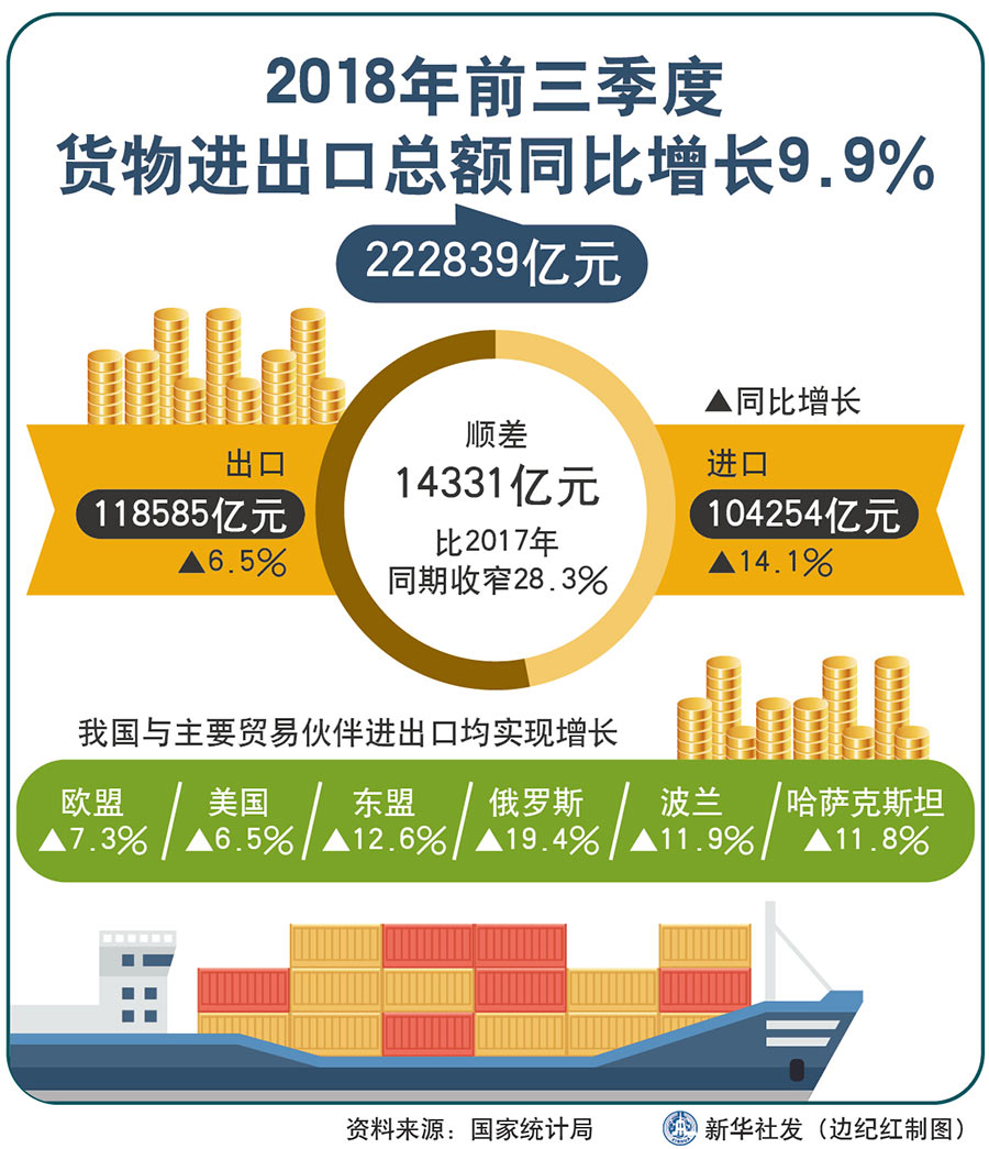 今年前三季度,我国外贸进出口总值比去年同期增长9.9%,进出口值逐季提升;我国新设立外商投资企业近4.6万家,与去年同期相比接近翻番。