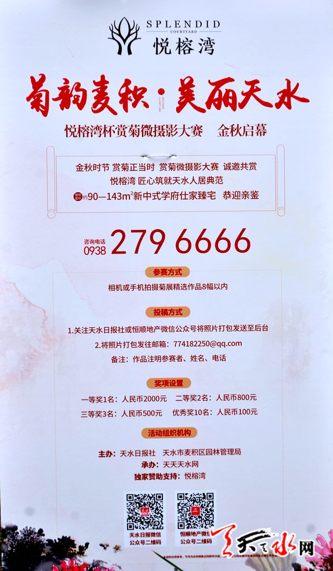 天天天水网讯【记者 张文都】10月20日,2018年麦积区“菊韵麦积、美丽天水”悦榕湾杯赏菊微摄影大赛拉开帷幕。本次活动以“菊韵麦积、美丽天水”为主题,游人用手机或者相机拍的精美照片,均可参与本次摄影比赛,并可获得丰厚大奖。