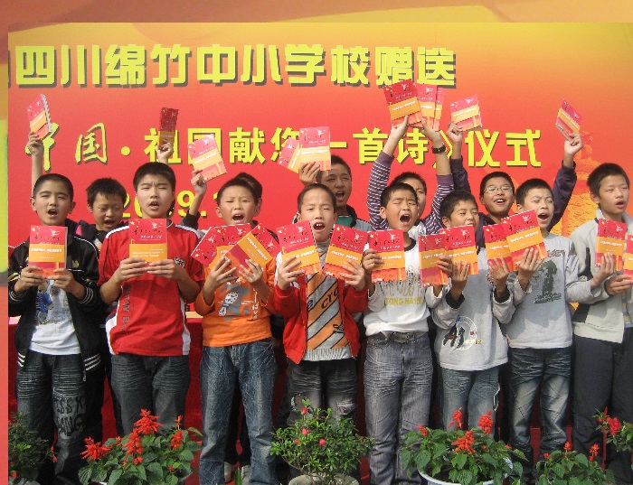 张锋赶赴四川灾区,赠送爱国诗歌集。图片来源:南通文明网