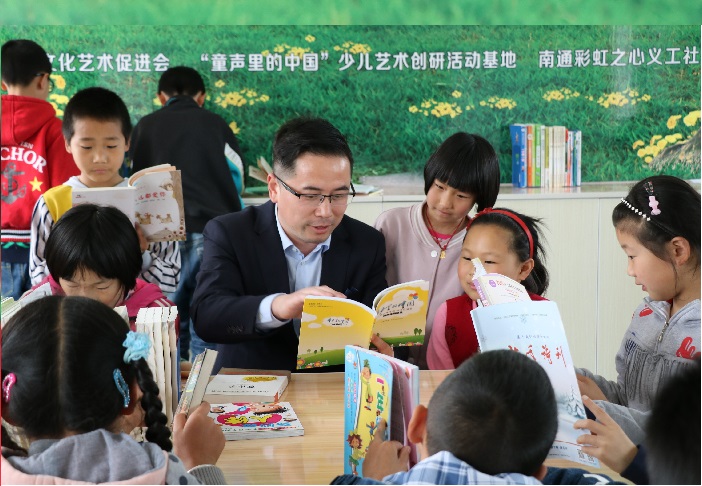 张锋(中)发起“童声书屋”,与乡村儿童共享书香阅读。图片来源:南通文明网