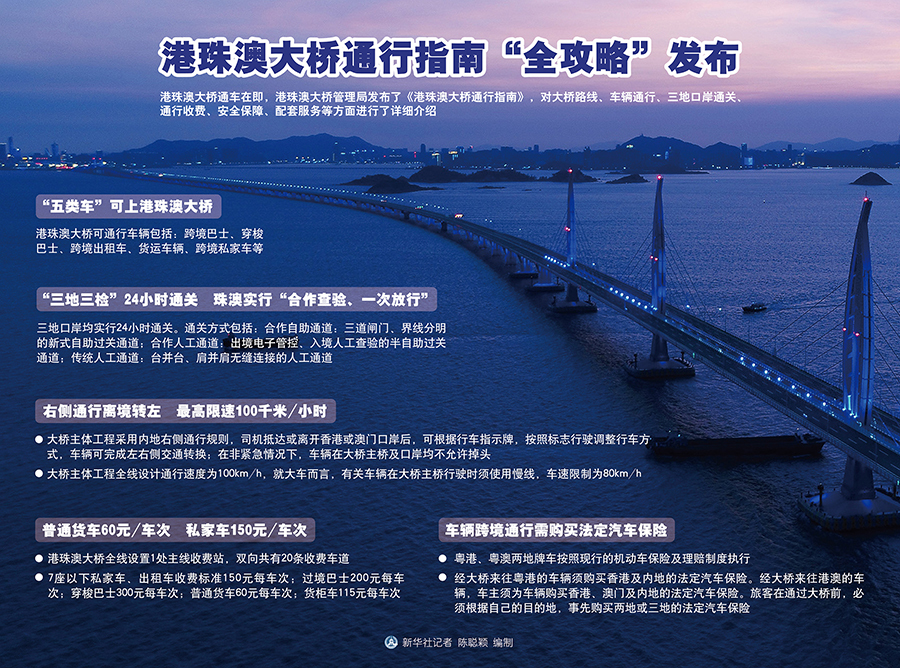 新华社广州10月21日电(记者 周强)港珠澳大桥通车在即,港珠澳大桥管理局发布了《港珠澳大桥通行指南》,对大桥路线、车辆通行、三地口岸通关、通行收费、安全保障、配套服务等方面进行了详细介绍。