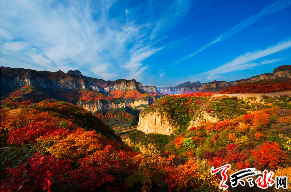 欣赏完潭水和瀑布。我们可以去乘车欣赏百里群山挂红,那才是醉人的秋色。万仞群山,都在满山红叶笼罩之下,古老的太行山披上了节日的盛装。像是为太行儿女办喜事一样,把自己打扮得红红火火。红叶红,秋草香,迷醉游人恋太行。在山的半腰有一条弯弯延延的盘山公路,汽车蹒跚前行,可以近赏红叶和远观山色。红色为主体颜色、其次是金黄颜色、在春夏长了半年的主角的绿色还有星星点点,淹没在无边的红海洋里,它们实在是不甘心退出主角的位置了。不过,此时的风流也是绿色最辉煌的时节,把最壮美的时刻呈现在世人面前。