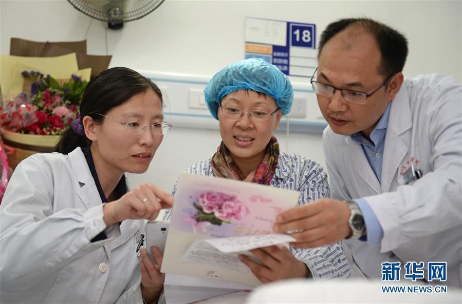 郭璐萍(中)在观看即将援非的医疗队成员为她创作的诗歌和集体签名卡片。图片来源:新华网