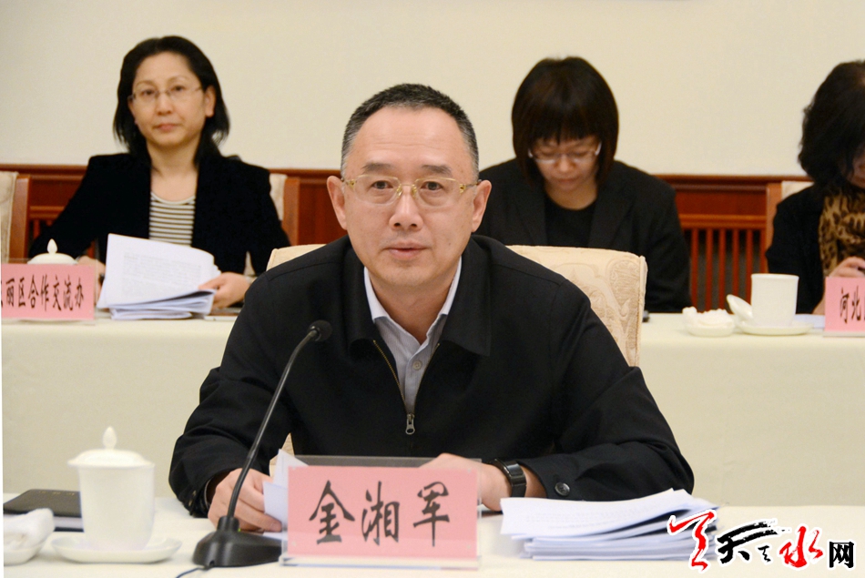 金湘军代表天津市委、市政府对天水市党政代表团表示热烈欢迎,并介绍了天津市经济社会发展情况。他要求天津市各有关部门和区要认真贯彻市委书记李鸿忠在全市东西部扶贫协作对口支援工作推进会上的重要指示精神,以及《天津市推进东西部扶贫协作和对口支援三年行动方案》,牢固树立“一盘棋”思想,全面升级加力,助推天水打赢脱贫攻坚战。一要在产业帮扶上升级加力。依托天水市特色旅游文化资源和基础条件,加强两市旅游文化合作,探索推动双方互为旅游目的地和客源输出地,组织区域内旅行社开展合作,引导本地游客到对方辖区旅游,实现互送客源人数每年递进上升。充分利用天津大型经贸会展活动,积极开展天水特色资源和产品展示,扩大天水特色产品影响力。二要在劳务协作上升级加力。进一步完善两市劳务输出对接机制,有组织地开展人岗对接,提高劳务协作规模和质量。同时扶持企业在天水市贫困乡村发展一批扶贫车间,帮扶贫困家庭劳动力就近就地就业增收。三要在社会动员上升级加力。各区要积极构建政府引导、企业参与、社会联动的大扶贫协作体系,实现两市从政府到社会、从干部到百姓、从经济建设和社会发展到慈善爱心的全方位交往、深层次交融。四要在结对协作上升级加力。各区要进一步健全完善携手奔小康行动方案,加大推动结对帮扶,并深入开展专业技术人才柔性支持。通过深入对接、深化交流、务实合作,切实助推天水打赢脱贫攻坚战。