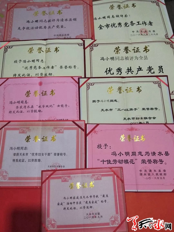 冯小明,43岁,中共党员,天水市清水县土门镇梁山村党支部书记, 2016年被评为天水市优秀党务工作者,2017年被授予天水市“三八红旗手”荣誉称号,在天水市第七次妇女代表大会中当选为执委。