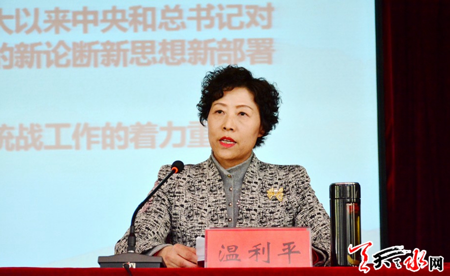 报告中,温利平回顾了党统一战线的发展历程,梳理了党的十八大以来中央和总书记对统战工作的新论断、新思想、新部署,并提出了做好天水统战工作的着力点。