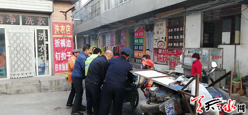 天天天水网讯 军垒巷地处罗玉路东方红城中村,周边流动人口较多、环境比较复杂,巷口流动摊点、巷内店外经营、乱吊乱挂、私搭乱建的情况较为突出。针对这一情况,我中队积极联合玉泉镇东方红村、区环卫局东关所、环保局、大气办等部门,于10月31日上午对军垒巷进行了集中整治。此次行动对流动摊点、店外经营、乱堆放杂物、小广告等进行了清理整顿,并下发《责令限期改正通知书》20余份,清理店外经营15家、铲除小广告50余处、清理流动摊点6家、拆除私搭乱建的简易棚2个。