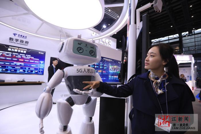 电信展台基于智能识别和5G技术的猜拳机器人和工作人员比赛。