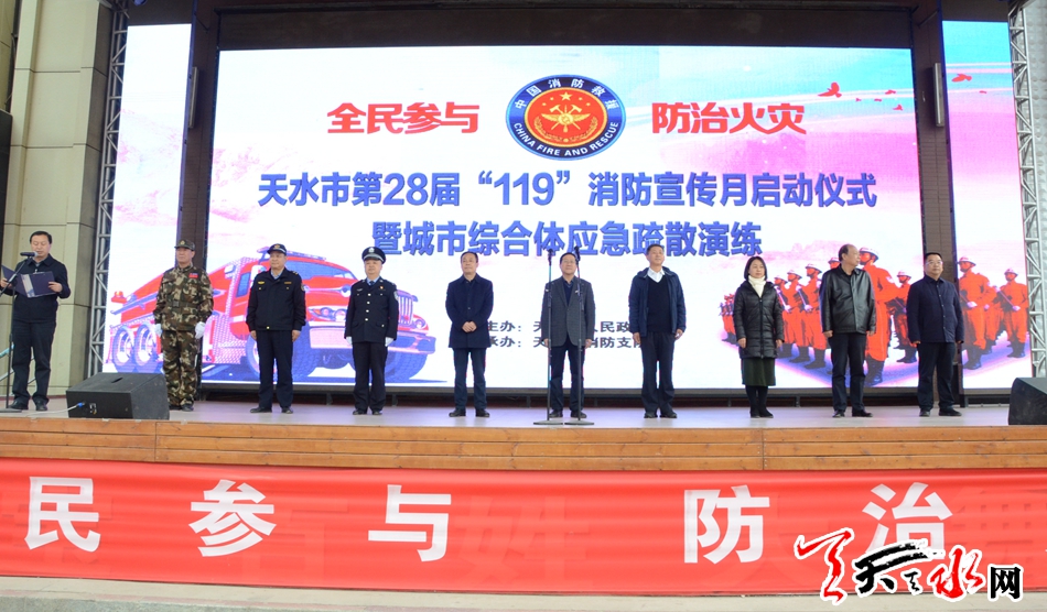 天天天水网讯【见习记者闫波】11月6日,天水市启动以“全民参与、防治火灾”为主题的第28届“119消防安全月”活动。市人大常委会副主任蒲朝晖,副市长、市公安局局长马瑛,市政协副主席郭明兴出席启动仪式。