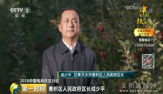 天天天水网讯 据麦积区政府网消息,在中央电视台2套财经频道举办的全国电商扶贫行动中,麦积区成功入选“全国百家电商扶贫特色县区”。由麦积区人民政府区长成少平现身推介我市名优农产品“花牛苹果”的宣传片已于11月7日7时中央电视台2套财经频道《第一时间》进行首播。7日晚20:30中央电视台2套财经频道王牌栏目《财经信息联播》栏目将再次进行播出。