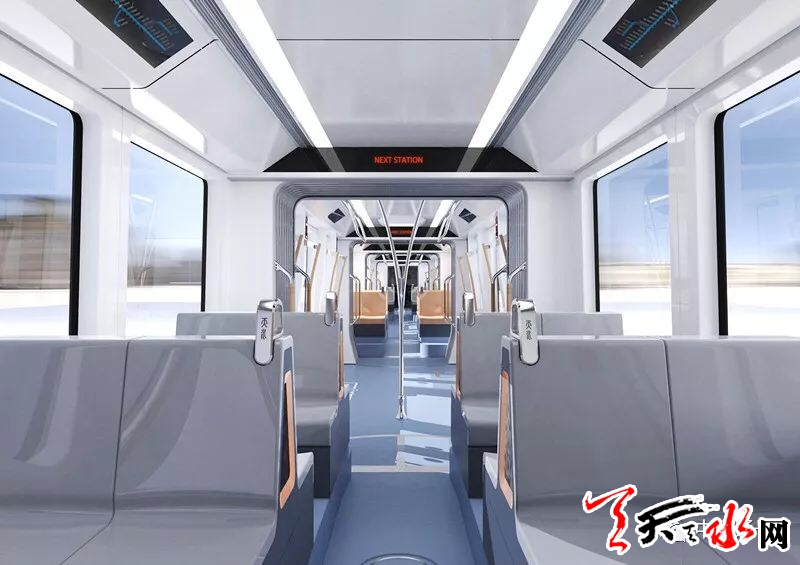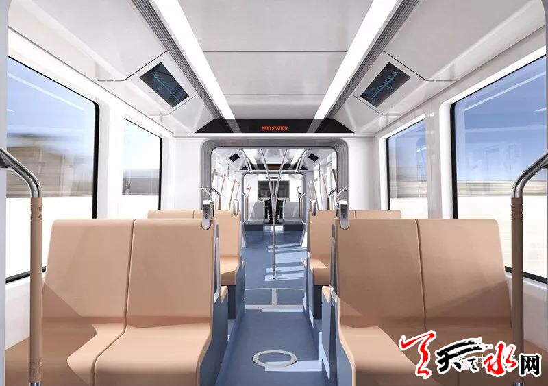 车身内部共有座位58个,承载力370人左右,主要色调为咖啡色与银灰色,代表着天水人民纯洁、质朴的内心,车内装饰提取了天水古建筑的各种元素,简约大方中透着典雅,丰富了空间肌理,增加了视觉层次。天水有轨电车的建设不仅仅代表了城市的发展、与时代的接轨,更是一种对特色文化的传承。