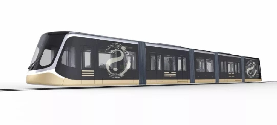 独特的地域文化是天水有轨电车设计的灵感源泉。此次公开的车模由中国通号旗下通号车辆公司制造,比例1:10,车辆为五模块100%低地板有轨电车,走行部为钢轮钢轨制式,由五节车厢组成,时速可达70km/h。车头正面的装饰沿着玻璃曲线向四周延展,模拟飞扬的龙须与延伸的龙角,行云流水般贯穿式车灯将车体上下划分开来,上银下金的色彩基调象征着浩瀚的天空与富饶的大地,灵动的腾龙太极与伏羲八卦,让华夏民族的图腾与当地文化交相呼应,为造型充满现代感车身增添一抹威严、庄重的气息。